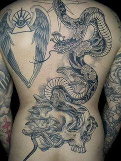 Whether Black and Grey or color she enjoys styles that are classic, illustrative and ornamental. Of particular interest is Japanese tattooing and its influence on Art Nouveau alongside Art Deco with its graphic and stylized elements. Inspired by themes drawn from the natural world and gravitating to anything humorous or wynorrific her focus is on strong, decorative tattooing